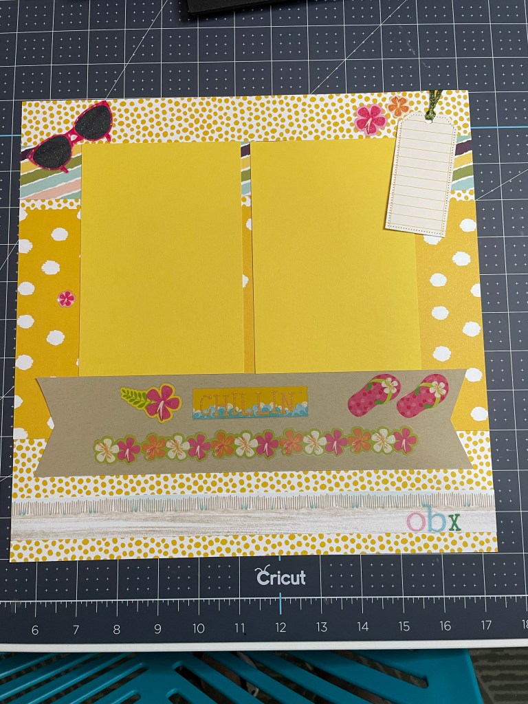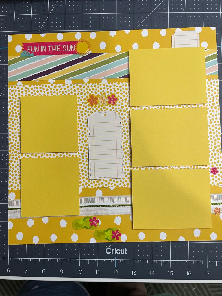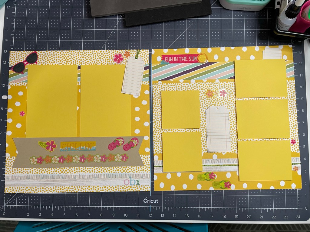 I created this two page 12 x 12 layout using patterned paper, cardstock, and some old stickers. I wanted something “sunny”, so I started with finding two papers with just yellow and white that I could use as my two pattern base pages. I will link any available products at the bottom of this post.