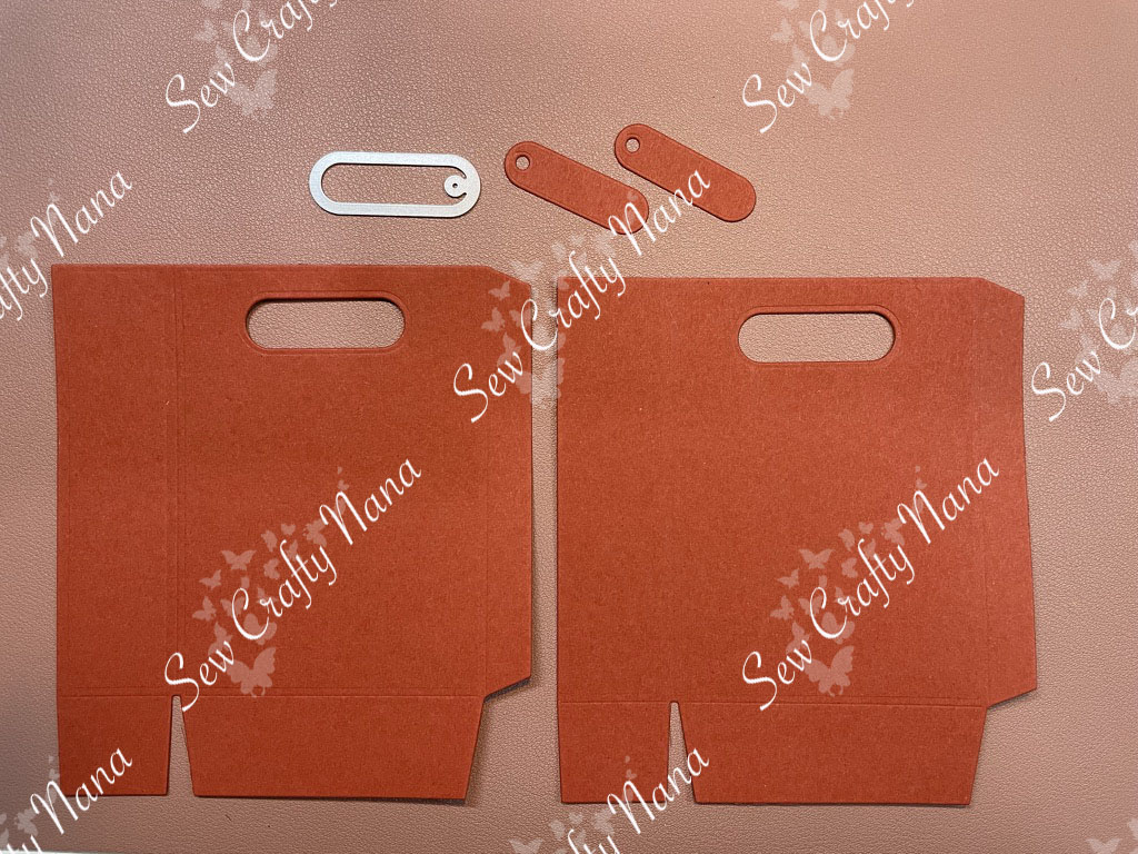 I wanted to figure out something different from punching holes and putting the normal double handles on these bags. Those are fine, but I wanted something different. I found that you can use the little oval tag die from the Sending Cheer dies to cut out handles that look just like full size gift bags – so cool!
