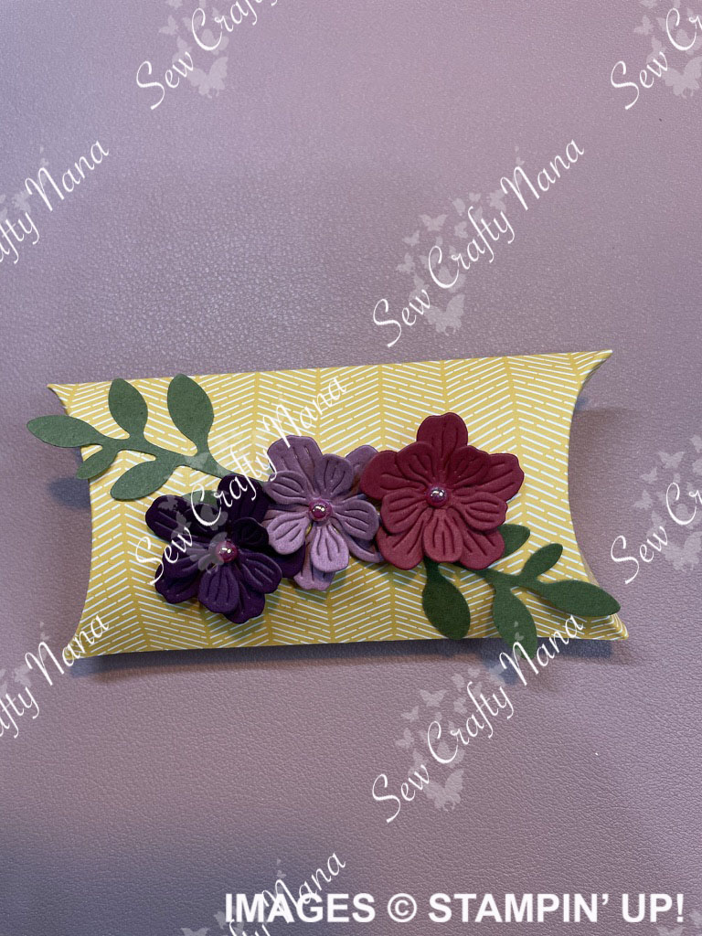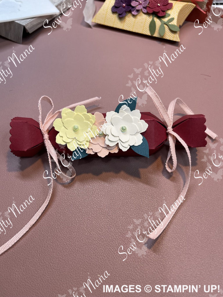 Pillow boxes are a super simple way to have a cute giveaway. They go together simply and are really easy to decorate since they lay flat. For mine, I used a retired flower die, but these could easily be replaced with the Petal Park Punch flowers like the cracker box below. Three little flowers and two sprigs from the Bough Punch and that’s it!! So simple but really pretty!