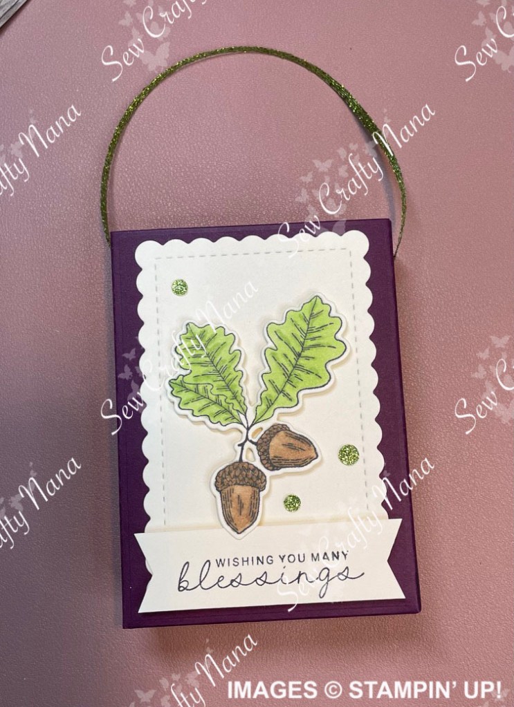 I colored the acorns with Stampin’ Blends alcohol markers. The image is stamped with Tuxedo Black Memento ink on Very Vanilla cardstock. I used Granny Apple Green (light & dark) for the leaves and Pecan Pie (light & dark) for the acorns.