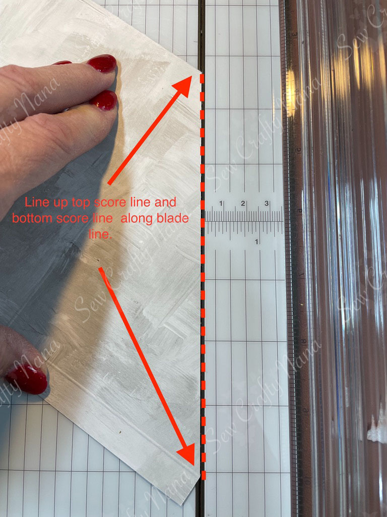 Cut your DSP to 6” x 12” – so you are using ½ sheet for one card. Score this as indicated on the picture – ½” along the bottom edge (pay attention to directionality of paper) and at 3-7/8” and 8-1/8”. Then you can cut off the two bottom rectangles from each end and miter (angle) the remaining rectangle tab. Cut off the triangles from each flap by cutting from the top score line to the bottom corner.